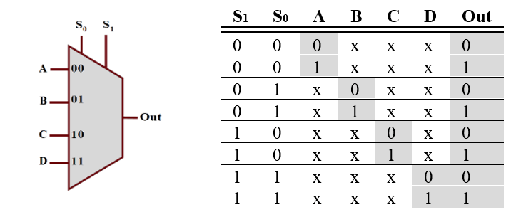 Output terakhir adalah pada selektor = 100 → X4 = 1