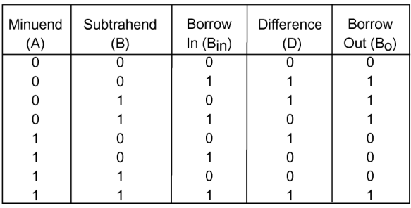 Berdasarkan tabel tersebut, kita dapat melihat bagaimana output D dan Bo berubah sesuai dengan perubahan kombinasi input. Misalnya, saat A=0, B=1, dan Bin=0, maka: